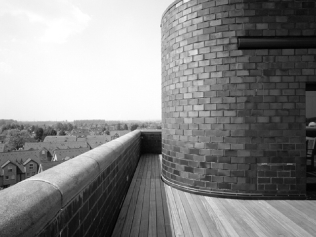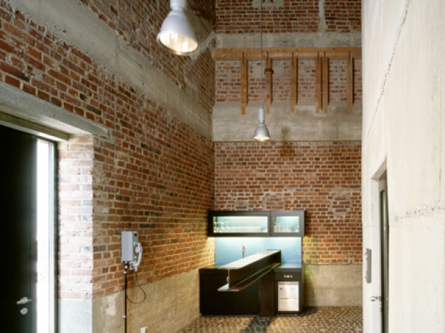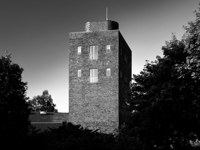 vom Getreidesilo zum WohnturmDer Getreidesiloturm ist 1963 entstanden. Es handelt sich um ein einfaches zweckbestimmtes Gebäude, dass mit mehreren Lagerhallen ein kleines Gebäude-Ensemble bildet. Die Grundidee zum Umbau des 20 Meter hohen Turmes ist ein „Adlerhorst“. Der Turm hat eine Grundfläche von 9,01 x 12,24 m und besteht aus einem 36,5 cm starkem Mauerwerk, welches durch 4 Stahlbetonringbalken gehalten wird. Die innen vorhandenen Holzkonstruktionen sowie das Dach wurden vollständig entfernt. Drei neue Stahlbetondecken im oberen Drittel des Turmes bilden die neuen Wohngeschosse und eine Dachterrasse. Die Erschließung vom Erdgeschoss bis zur Dachterrasse erfolgt in einem freigestellten neuen Sichtbetonkern mit Spindeltreppe und Aufzug. |
